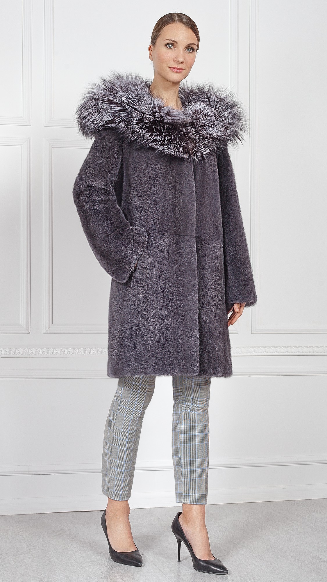 Шуба из меха норки, отделка чернобурая лиса